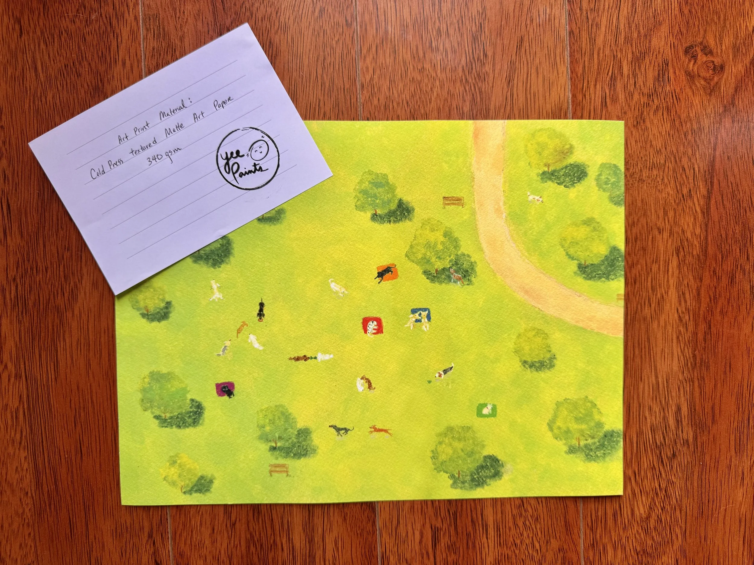 This 9x12-inch oil pastel art print captures sixteen charming pug poses, each full of personality and humor.